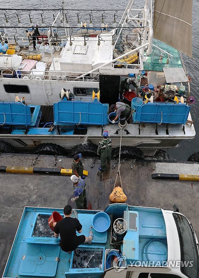 (강릉=연합뉴스) 유형재 기자 = 3일 오전 강원 강릉시 주문진항에서 오징어를 잡아 온 채낚기 어선의 산오징어가 활어차로 옮겨지고 있다.