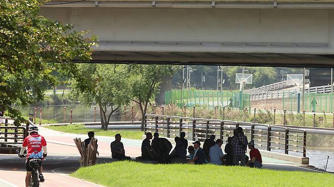 ▲ 2일 부산 동래구 온천천시민공원 연안교 하부 쉼터 그늘에서 어르신들이 더위를 식히고 있다.