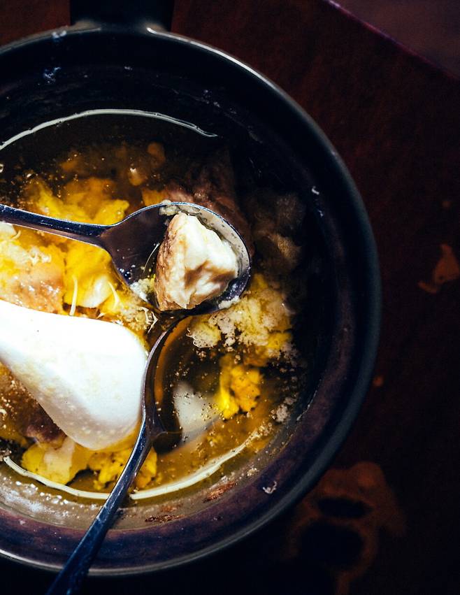 객실 가운데를 차지한 화롯가에 불을 피워 공기를 데운 뒤, 야크 버터티와 야크 요거트 그리고 야크 치즈를 내어 주었다. 칭커로 만든 넙대대한 빵 사이, 설탕 가득 뿌린 야크 요거트를 두툼히 채워 넣고서는 한입 베어 문다.