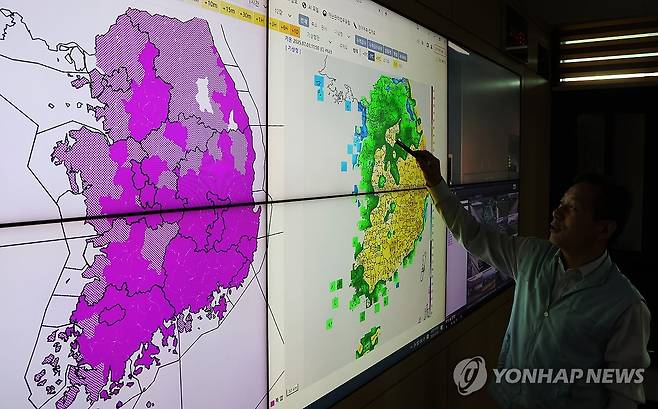 (수원=연합뉴스) 홍기원 기자 = 전국 대부분 지역에 폭염 특보가 내려진 3일 경기도 수원시 권선구 수도권기상청에서 예보관이 특보 발효 상황 등을 설명하고 있다. 2025.7.3