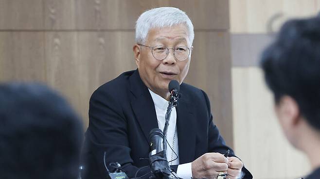 ▲ 교황청 성직자부 장관 유흥식 추기경이 3일 서울 광진구 한국천주교주교회의에서 열린 기자간담회에서 질의응답하고 있다.