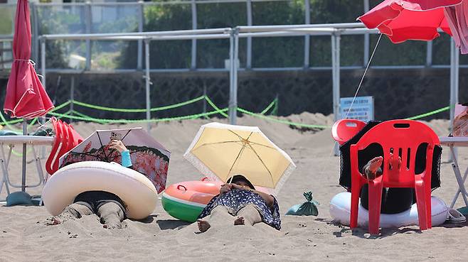 ▲ 3일 오전 제주시 삼양해수욕장을 찾은 피서객이 모래찜질을 하고 있다.