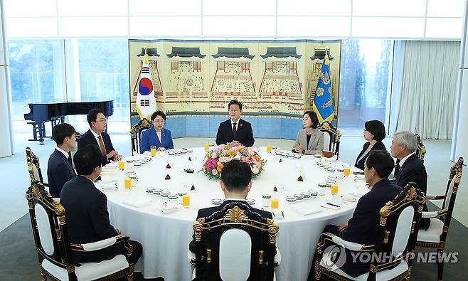 (서울=연합뉴스) 한상균 기자 = 이재명 대통령이 3일 서울 한남동 관저에서 비교섭단체 5당 지도부 오찬 회동을 하고 있다. 2025.7.3 [대통령실통신사진기자단]
