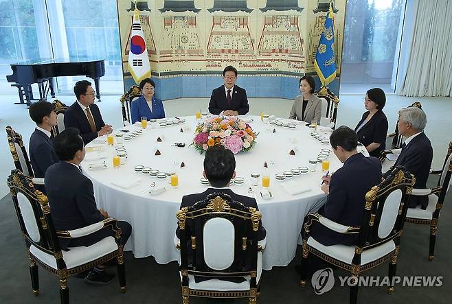 (서울=연합뉴스) 한상균 기자 = 이재명 대통령이 3일 서울 한남동 관저에서 비교섭단체 5당 지도부 오찬 회동을 하고 있다. 2025.7.3 [대통령실통신사진기자단]