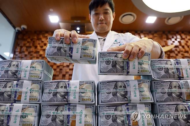 사진은 이날 서울 중구 하나은행 본점 위변조대응센터에서 직원이 미국 달러화를 들어 보이는 모습. 2025.7.3