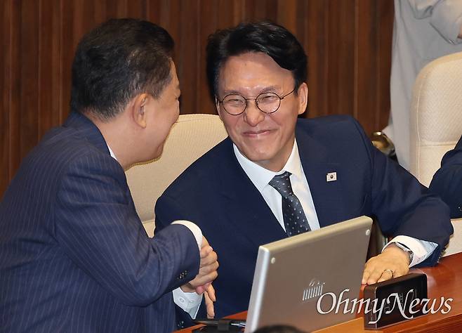 | ▲ 축하받는 김민석 국무총리 후보자 김민석 총리 후보자가 3일 국회 본회의에서 임명동의안 통과 후 김병기 더불어민주당 당대표 직무대행 겸 원내대표로부터 축하받고 있다. |