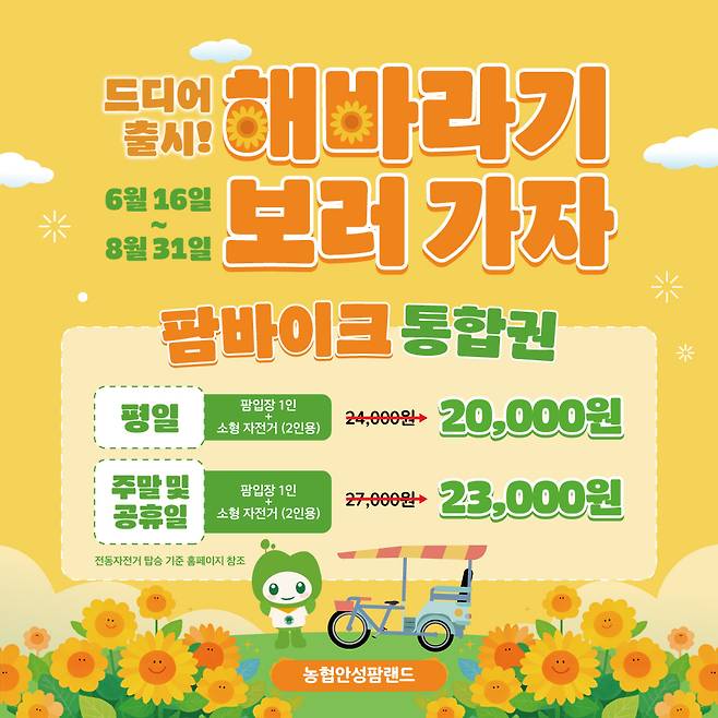 농협 안성팜랜드(분사장 강민경)가 본격적인 해바라기 시즌을 맞아 팜랜드를 방문한 관람객들이 넓게 트인 자연 속에서 전동자전거를 타며 시원하게 즐길 수 있도록 '팜 바이크 통합권'을 출시했다.