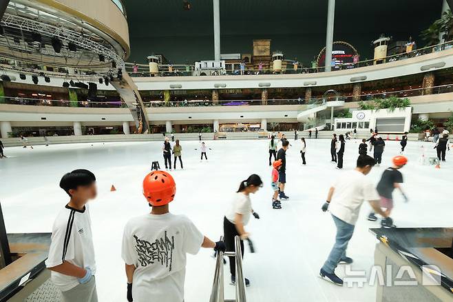 [서울=뉴시스] 최진석 기자 = 전국 대부분 지역에 폭염특보가 발효된 3일 서울 송파구 잠실롯데월드 아이스링크에서 고객들이 스케이트를 즐기고 있다. 2025.07.03. myjs@newsis.com
