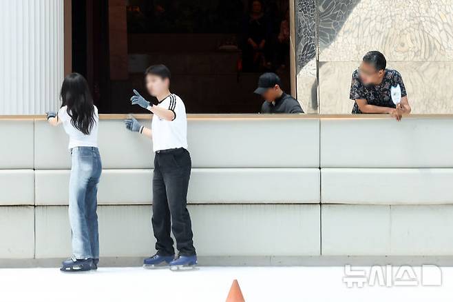 [서울=뉴시스] 최진석 기자 = 전국 대부분 지역에 폭염특보가 발효된 3일 서울 송파구 잠실롯데월드 아이스링크에서 한 시민이 부채질을 하며 빙판을 바라보고 있다. 2025.07.03. myjs@newsis.com