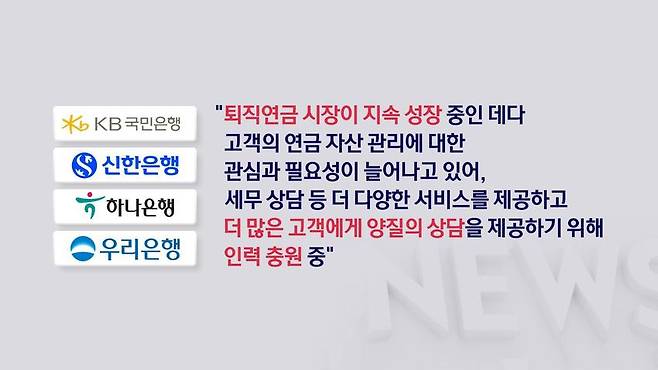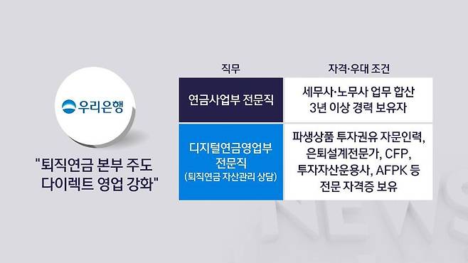 가장 적극적으로 채용에 나선 우리은행의 경우 "연금사업본부 주도로 다이렉트 영업을 강화한다"라고 밝혔습니다.