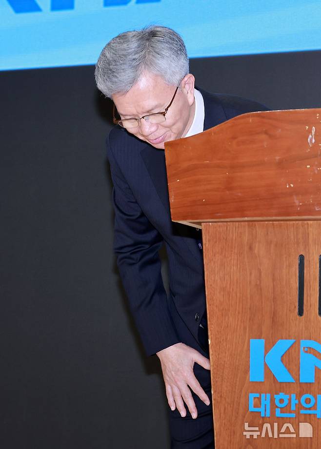 [서울=뉴시스] 이영환 기자 = 김택우 대한의사협회 회장이 3일 오후 서울 용산구 대한의사협회에서 의료현안 정례 브리핑을 마친 후 인사를 하고 있다. 2025.07.03. 20hwan@newsis.com