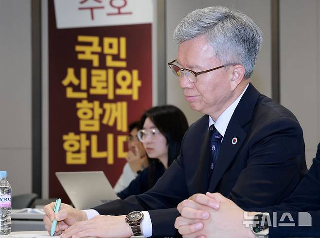 [서울=뉴시스] 이영환 기자 = 김택우 대한의사협회 회장이 3일 오후 서울 용산구 대한의사협회에서 의료현안 정례 브리핑을 마친 후 자리에서 메모를 하고 있다. 2025.07.03. 20hwan@newsis.com