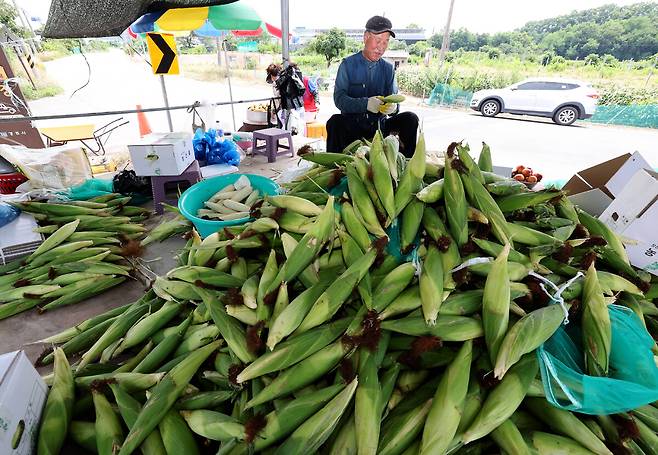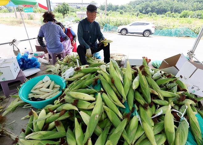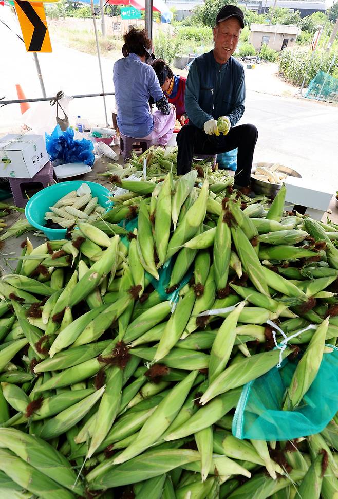 불볕더위가 연일 기승을 부리는 가운데 반가운 여름 간식이 돌아왔다. 3일 오후 경주시 강동면 단구1리 마을회관 앞에서 주민들이 수확한 햇옥수수를 손질하고 있다. /이용선기자 photokid@kbmaeil.com
