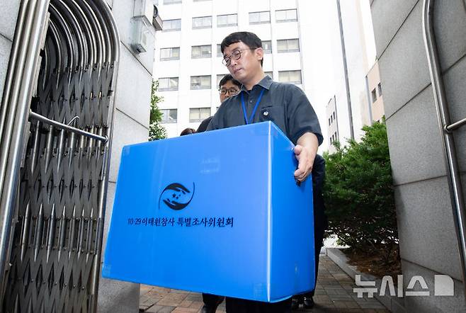 [서울=뉴시스] 황준선 기자 = 10.29 이태원참사 특별조사위원회 관계자들이 3일 오후 서울 마포구 서울서부지방검찰청에서 이날 입수한 10.29 이태원참사 관련 불기소 처분 사건 수사기록을 옮기고 있다.