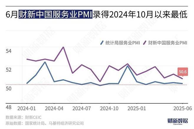 3일 차이신과 로이터, 블룸버그통신에 따르면 6월 차이신 서비스업 PMI는 전월(51.5)보다 0.5포인트 내려간 50.6으로 집계됐습니다.