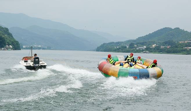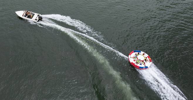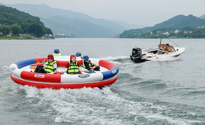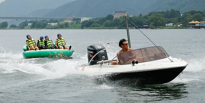체감온도 33도의 찜통 더위가 계속되는 가운데 3일 경기 남양주시 화도읍 더드림핑에서 시민들이 수상 레포츠를 즐기고 있다.