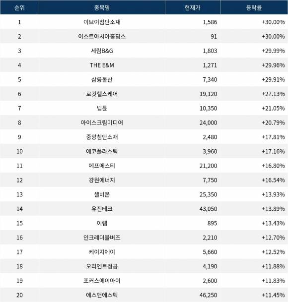 6위 로킷헬스케어(376900)는 종가 19,120원으로 +27.13% 상승 마감했다. 7위 넵튠(217270)은 종가 10,350원으로 +21.05% 상승 마감했다. 8위 아이스크림미디어(461300)는 종가 24,000원으로 +20.79% 상승 마감했다. 9위 중앙첨단소재(051980)는 종가 2,480원으로 +17.81% 상승 마감했다. 10위 에코플라스틱(038110)은 종가 3,960원으로 +17.16% 상승 마감했다.