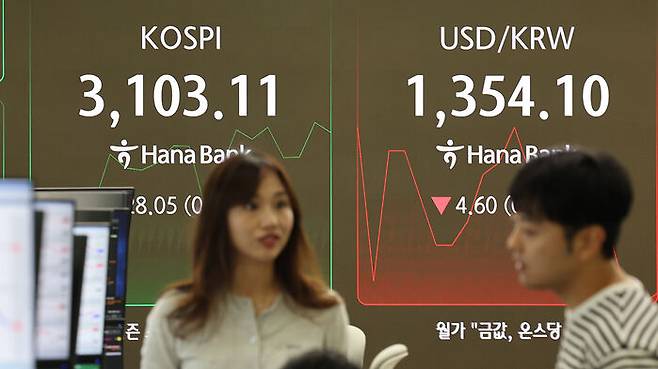 ▲ 코스피가 상승 출발한 3일 서울 중구 하나은행 딜링룸에서 딜러들이 대화하고 있다.