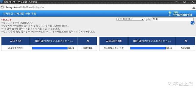 3일 기준 필수 자치법규 마련율은 전국 17개 시·도에서 제주가 96.4%로 가장 높았다. 95.2%를 기록한 경남이 제주 다음을 차지했다.