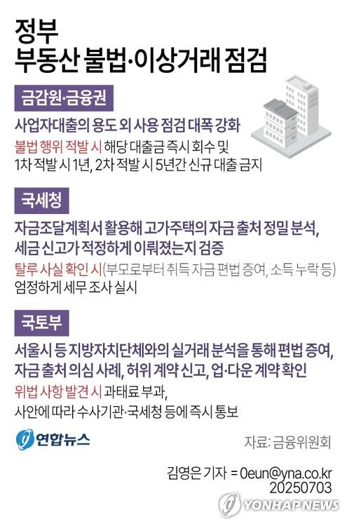(서울=연합뉴스) 임수정 기자 = 정부가 지난달 27일 발표한 부동산 대출 규제를 회피하기 위해 사업자대출금을 주택 거래에 활용하거나 이른바 '부모 찬스'로 고가주택을 편법 증여 받는 사례가 나타나는지 등을 집중 점검한다.