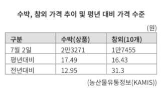 [파이낸셜뉴스] #. 최근 대형마트를 방문한 주부 A씨는 수박 가격판을 보고 살지 말지 고민에 빠졌다. 10일 만에 수박 값이 2000원 가량 올라서다. A씨는 수박 대신에 또다른 여름 과채류인 참외를 사려 했지만 역시나 비싼 가격에 혀를 내둘렀다.