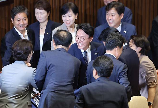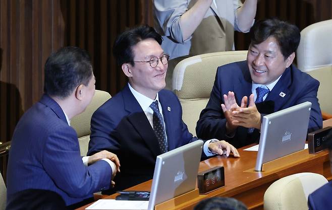 | 김민석 국무총리 후보자가 3일 오후 서울 여의도 국회에서 열린 본회의에서 국무총리 임명동의안이 가결된 뒤 동료 의원들의 축하를 받고 있다. |