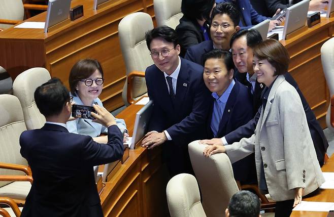 김민석 후보자는 임명동의안 표결이 진행되는 동안 연신 미소를 띄우며 동료의원과 기념촬영을 하거나 대화를 나눴다.