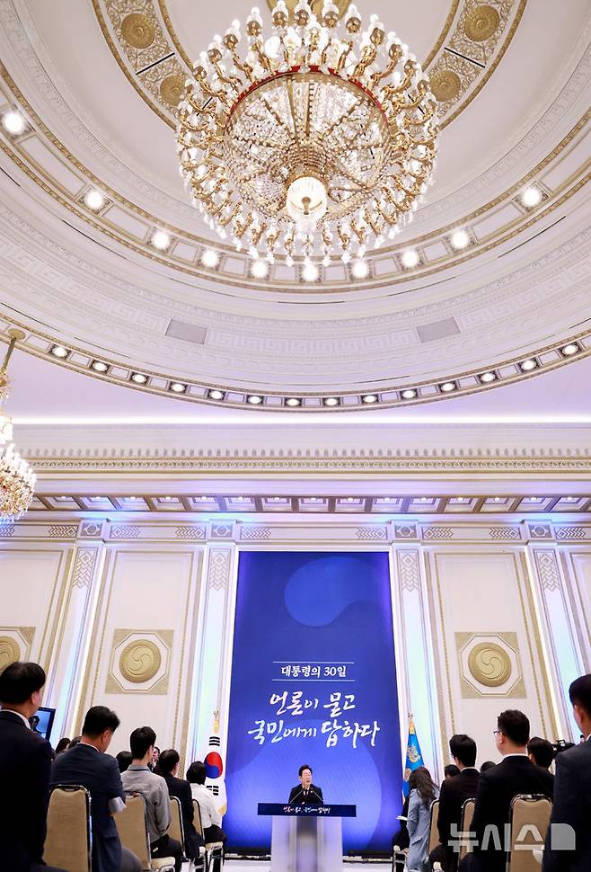 [서울=뉴시스] 고범준 기자 = 이재명 대통령이 3일 청와대 영빈관에서 열린 '대통령의 30일, 언론이 묻고 국민에게 답하다' 기자회견에서 출입기자들 질문에 답변하고 있다. (대통령실통신사진기자단) 2025.07.03. bjko@newsis.com