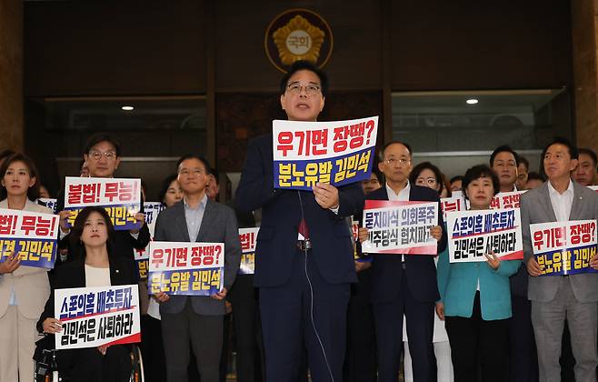 오후 2시 25분께 비공개 의원총회를 마치고 나온 국민의힘은 본회의장에 들어가지 않았다. 대신 '불법! 무능! 부적격 김민석', '우기면 장땡? 분노 유발 김민석', '스폰의혹 배추투자 김민석은 사퇴하라' 등의 글씨가 적힌 손팻말을 들고 본회의장 입구 앞에 늘어섰다. 권성동 전 원내대표는 손팻말을 들고 이동하던 도중 "맨날 규탄대회 하는 이 팔자는 언제 변하나"라고 혼잣말하기도 했다.
