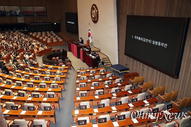 | ▲ 3일 국회 본회의에서 국민의힘 의원들이 불참한 가운데 김민석 국무총리 후보자 임명동의안이 상정되고 있다. |