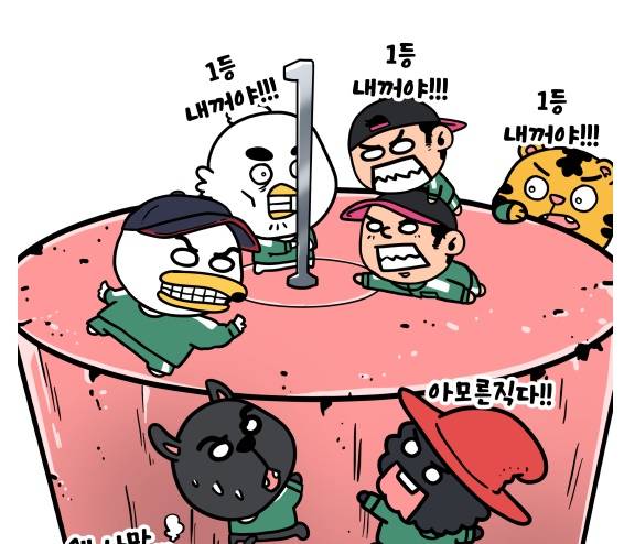 | ▲ 치열한 상위권 경쟁을 펼치고 있는 한엘롯기 (출처: 2025 KBO 야매카툰) |