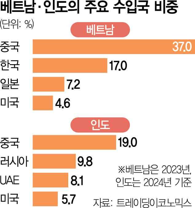 미국이 중국과 교역량이 많은 국가를 압박하며 대(對)중국 견제에 나선 것으로 풀이된다. 중국은 베트남(37%, 2023년 기준)과 인도(19%, 2024년 기준)의 최대 수입국으로 수입 물량은 해마다 증가하고 있다. 전문가들은 중국과 교역 규모가 급증하고 있는 유럽연합(EU)도 미국의 압박에서 벗어나기 어려울 것으로 내다봤다.