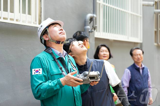 (부산=뉴스1) 윤일지 기자 = 김영욱 부산진구청장이 3일 부산진구 개금3동 일원에서 하절기 자연재난에 대비, 드론을 활용해 재해취약시설을 점검하고 있다. (부산진구 제공. 재판매 및 DB 금지) 2025.7.3/뉴스1