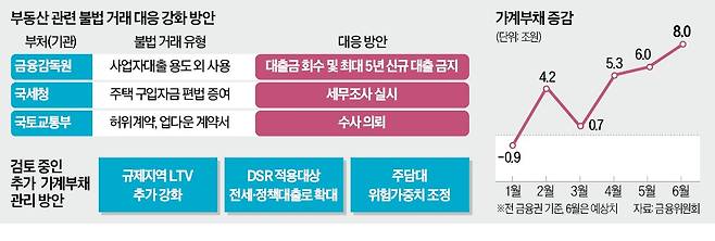 집값 잡기 총력전에 나선 정부가 우회 대출과 편법 증여 등 불법 부동산 거래를 차단하기 위해 집중 점검에 나선다. 규제 지역 담보인정비율(LTV) 강화, 전세·정책 대출 총부채원리금상환비율(DSR) 적용 등 추가 규제도 예고했다. 과도한 빚을 내 주택을 구입함에 따라 부동산시장이 왜곡돼온 ‘악순환의 고리’를 이번에 반드시 끊어내겠다는 방침이다.
