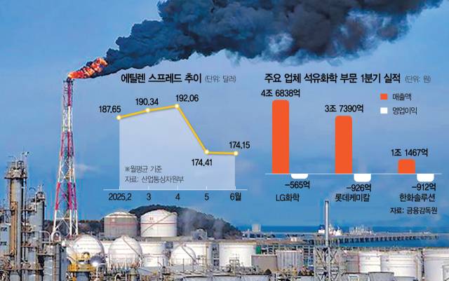 3일 산업통상자원부 원자재가격정보에 따르면 석유화학 업체들의 수익 지표인 에틸렌 스프레드는 6월 평균 톤당 174.15달러로 집계됐다. 이는 5월(174.41달러)보다 더 악화한 것으로 2월(187.65달러) 이후 가장 낮은 수준이다. 에틸렌 스프레드는 에틸렌 가격과 생산 단가의 핵심인 나프타 가격의 차이로 석유화학 업체들의 채산성을 가늠하는 핵심 지표다. 손익분기점이 250~300달러인 만큼 반토막난 채산성이 회복의 기미가 없는 셈이다.