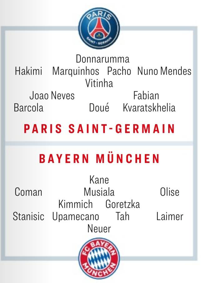 4-2-3-1 대형으로 예상한 뮌헨 스타팅 명단은 해리 케인이 최전방에서 상대 골문을 조준하고 킹슬리 코망-자말 무시알라-마이클 올리세가 한 칸 아래에서 뒤를 받친다. 요수아 키미히-레온 고레츠카가 '팀 허리'에서 공수를 조율하고 포백은 왼쪽부터 요시프 스타니시치-다요 우파메카노-요나탄 타-콘라트 라이머가 뱅상 콤파니 감독 낙점을 받을 것으로 내다봤다.