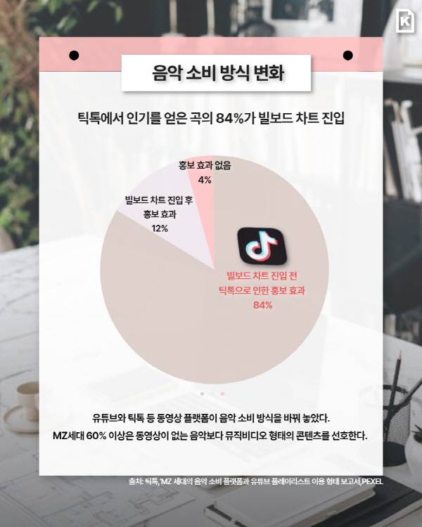 영상 플랫폼에 최적화된 짧고 강렬한 음악이 주류가 되면서 음악 구조 역시 변하고 있다. 도입부 15~30초 안에 강한 인상을 남기는 구조가 보편화되고, 서사보다 즉각적 자극과 반복적 후렴구를 강조하는 경향이 강해졌다. 이를 증명하듯, 틱톡이 발표한 ‘2024 Music Impact Report’는 틱톡에서 인기를 얻은 곡의 84%가 빌보드 차트에 진입했다고 소개한다. 한국 걸그룹 피프티피프티(FIFTY FIFTY)의 노래 ‘큐피드’도 이런 현상을 대표하는 사례다.