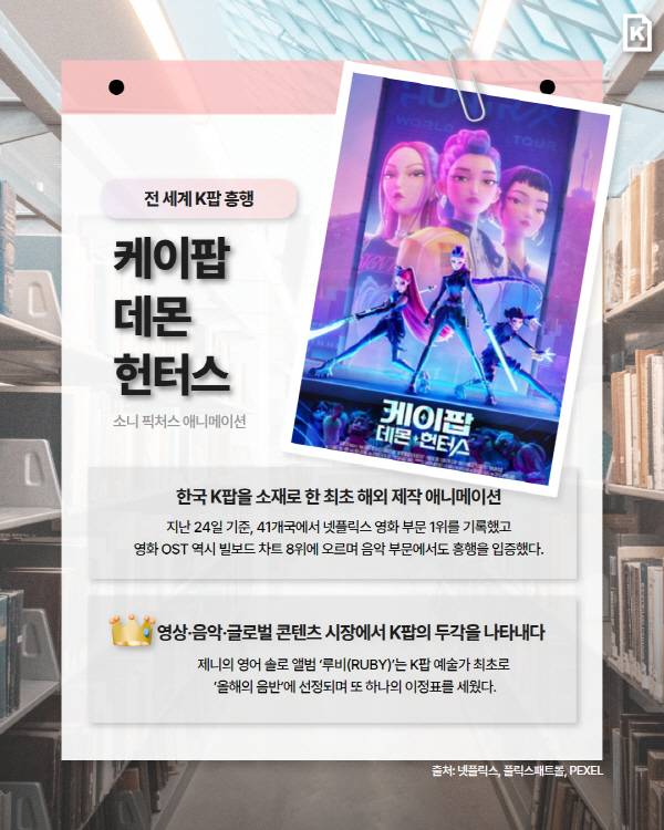 K팝을 소재로 지난달 20일 공개된 영화 '케이팝 데몬 헌터스'는 나흘 뒤 온라인 동영상 서비스(OTT) 콘텐츠 순위 분석 사이트 플릭스패트롤(Flixpatrol)을 기준으로 한국 미국 대만 태국 필리핀 싱가포르 포르투갈 등 41개국에서 넷플릭스 영화 부문 1위를 차지했다.