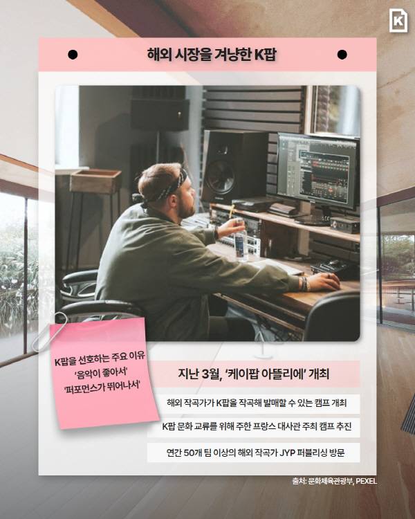 이에 K팝도 영어 가사 비중을 늘리고 해외 작곡가 참여를 확대하며 글로벌 시장에 최적화된 방향을 택하고 있다. 지난 3월 주한 프랑스 대사관은 해외 작곡가가 K팝을 작곡해 발매할 수 있는 ‘케이팝 에뜰리에’ 캠프를 열었고, JYP 퍼블리싱은 연간 50개 팀 이상 해외 작곡가와 협업한다. K팝이 세계인의 취향을 반영하며 변화하고 있음을 보여준다.