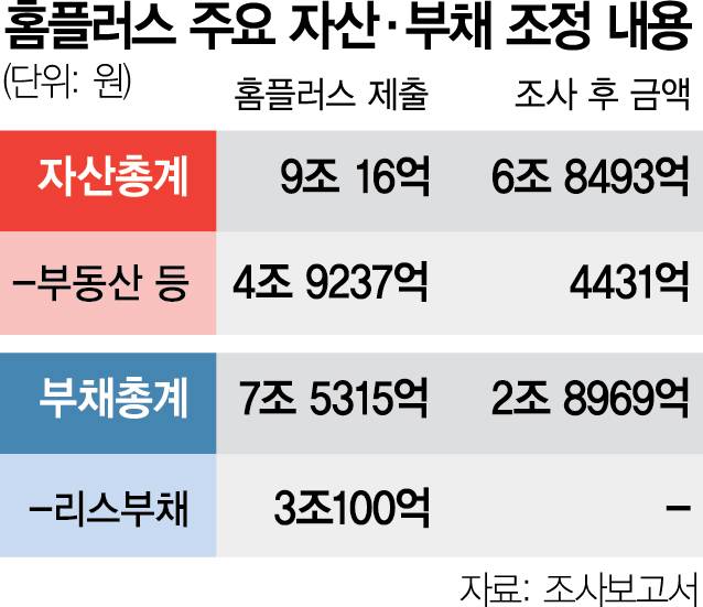 3일 서울경제신문이 입수한 홈플러스 조사 보고서를 보면 홈플러스는 부채 총계를 7조 5315억 원으로 제출했고 조사위원은 이 중 4조 6345억 원 줄인 2조 8969억 원으로 산정했다. 여기에 자산 6조 8493억 원에서 부채를 제외한 청산가치는 3조 6816억 원이었다.
