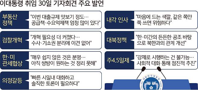 이 대통령은 부동산 정책을 언급하던 도중 지난달 27일의 대출 규제책에 대해 맛보기 정도라며 더 강한 규제책을 쓸 수도 있음을 예고했다. 부동산 시장에 보낸 직접적 경고 메시지다. 국정 최고책임자가 시장에 압박 시그널을 명확히 발신한 셈이다. 이 대통령이 회견 도중 “경제는 심리 측면이 매우 강하다”고 한 것과도 맥이 닿은 발언으로 여겨진다.