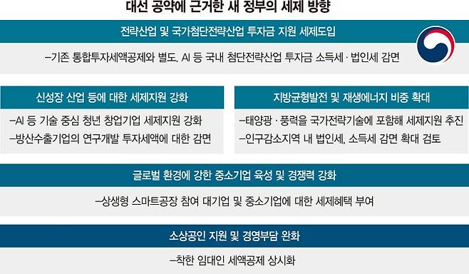 이 대통령이 대선 공약으로 내걸었던 전략산업 국내생산 촉진세제 도입이 유력하다. 기존의 '통합 투자세액공제'와 별도로 국가전략기술급 및 신성장·원천기술급 첨단 제품이 대상이다. 국내에서 최종 생산·판매한 기업들에 생산량, 판매량에 비례해 법인세를 공제하는 방식이다. 이차전지, 반도체 기업 등의 해외이탈을 막는다는 점에서 '한국판 IRA'로도 불린다.