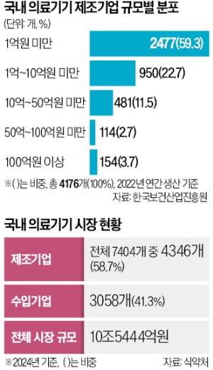 한국보건산업진흥원이 2024년 발표한 '제1차의료기기산업 실태조사 및 2023년 시장동향 분석'에 따르면 국내 의료기기 제조기업 4176곳 중 80%가 연 매출 10억원 미만이며, 97%가 중소기업이었다.