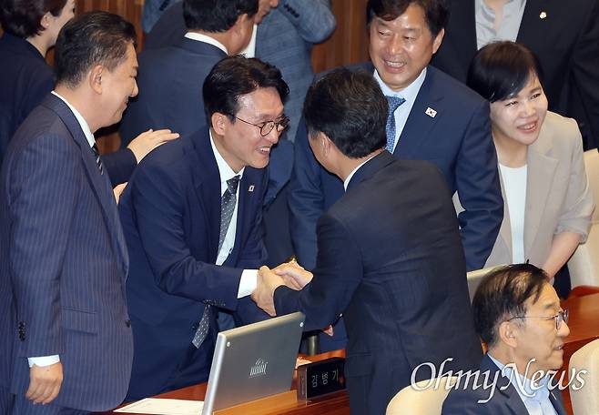 | ▲ 축하받는 김민석 국무총리 후보자 김민석 총리 후보자가 3일 국회 본회의에서 임명동의안 통과 후 동료 의원들로부터 축하받고 있다. |