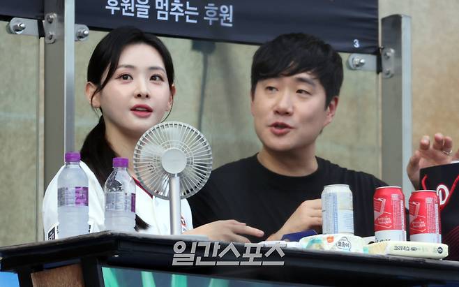 시구를 한 배성재 아나운서가 아내인 김다영 아나운서와 경기를 관전하고있다.