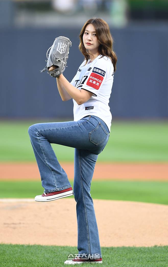 배우 유인영이 3일 수원 KT위즈파크에서 열린 2025 KBO리그 KT와 키움의 경기 시구를 하고 있다.