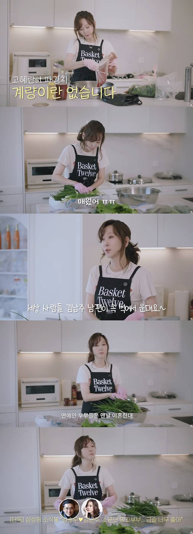 이어 김남주는 미라 까둔 파를 냉장고에서 꺼내며 "왜이렇게 맵냐. 하다가 울지도 모른다. 그럼 세상사람들한테 말해달라. 김승우씨가 속 썩여서 우는거라고"라고 너스레를 떨었다.
