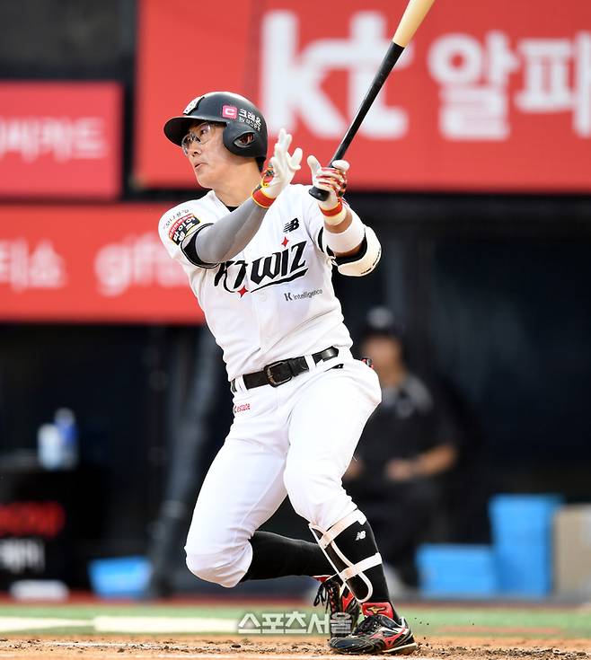KT 허경민이 3일 수원 KT위즈파크에서 열린 2025 KBO리그 키움과 경기 2회말 타구를 바라보고 있다. 중견수 플라이 아웃.