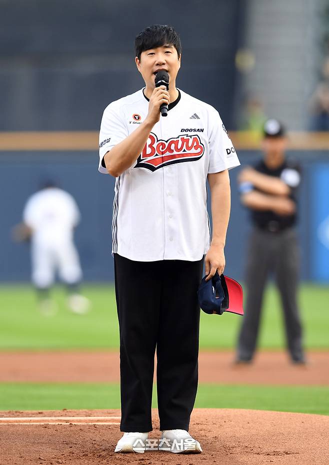 방송인 배성재가 3일 잠실구장에서 열린 2025 KBO리그 삼성과 두산의 경기에 앞서 시구를 하기 전 소감을 밝히고 있다. 2025. 7. 3.