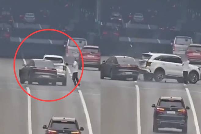 영상 속 한 남성은 차량이 갑자기 멈추자 비상등을 켜고 차에서 내렸다. 그는 휴대전화로 통화를 하며 트렁크 근처에 서 있었고, 뒤따라오는 차량을 향해 손을 흔들며 비켜 가라는 제스처를 취했다.